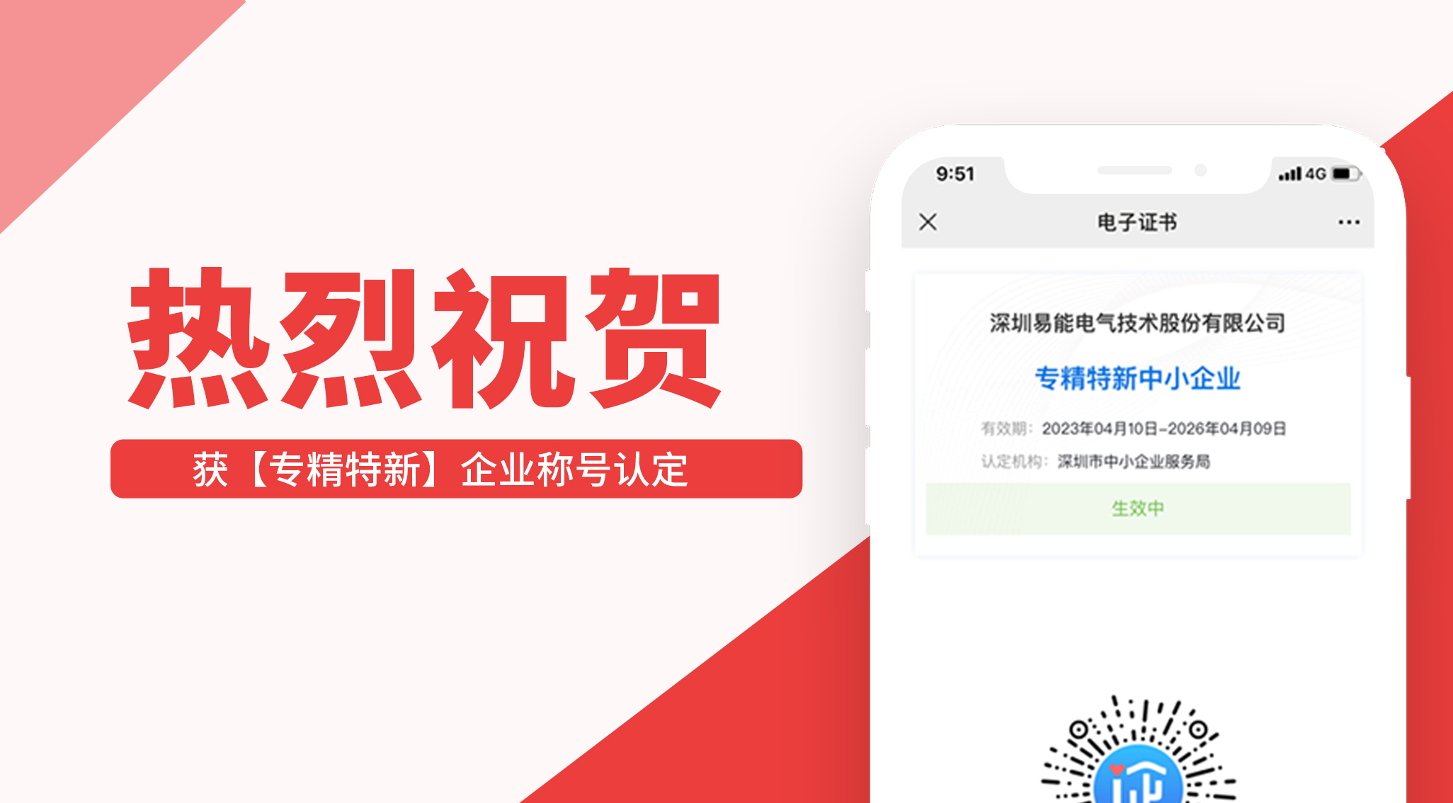 據深圳市“專精特新”中小企業名單公示,易能電氣憑借專業技術水平,創新能力等綜合實力成功獲評深圳市“專精特新”中小企業稱號。